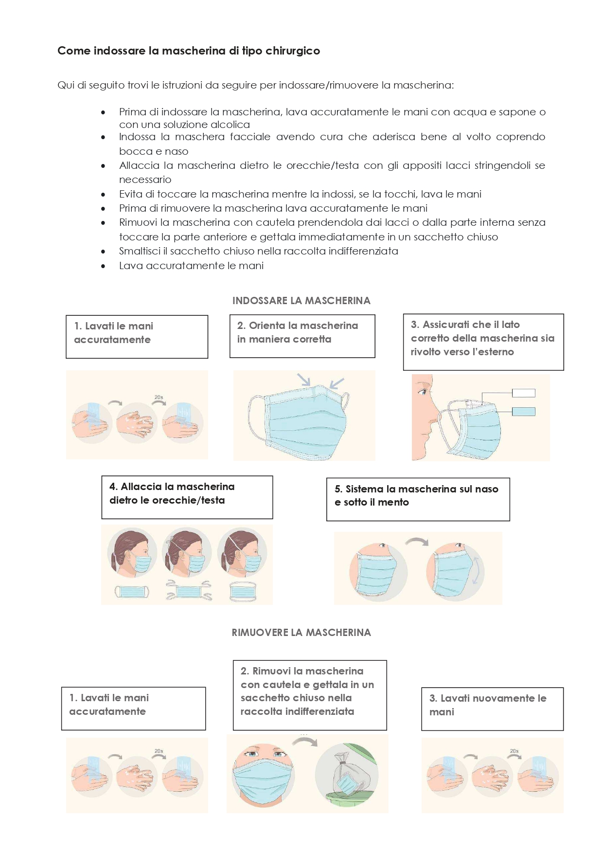 Si raccomanda di attenersi strettamente alle istruzioni operative per indossare e rimuovere le mascherine, nonché per la corretta modalità di conservazione e di smaltimento, che verranno fornite insieme alle stesse (VEDI SLIDE)