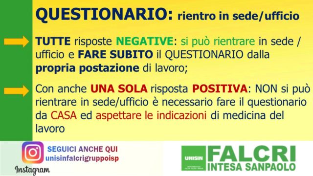 ▪️ in caso di risposte tutte negative alle domande poste dal Questionario, è consentito rientrare al lavoro per procedere immediatamente alla compilazione e alla trasmissione dello stesso Questionario direttamente dalla postazione d’ufficio;