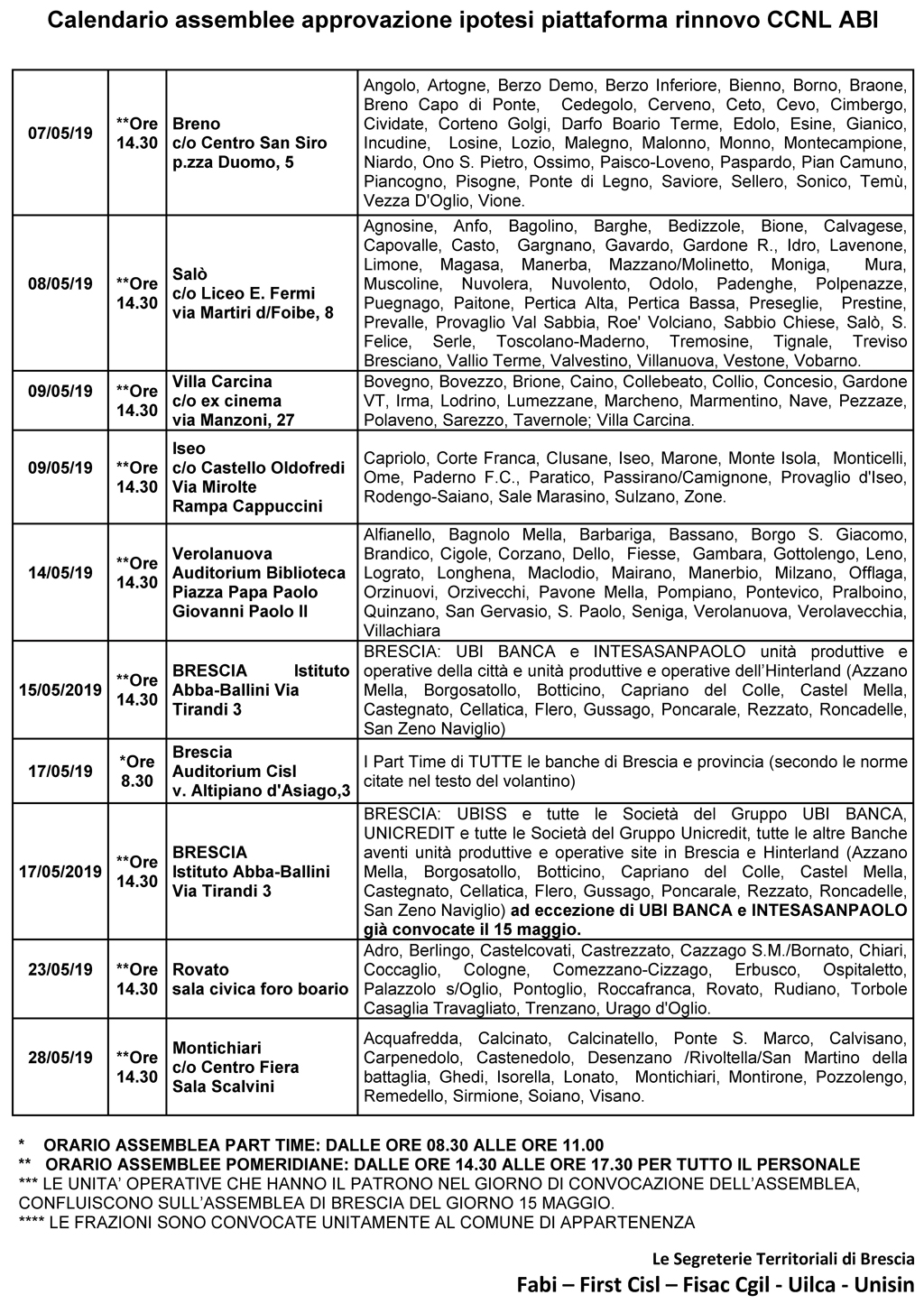 Le Segreterie Territoriali delle Organizzazioni Sindacali firmatarie organizzano le Assemblee per approvare la nostra Piattaforma di rinnovo del CCNL da presentare ad Abi, a sostegno della difficile vertenza che ci vedrà impegnati nei prossimi mesi, secondo il calendario di cui alla pagina seguente.