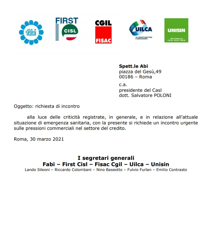 Home Comunicati Comunicati 2021 Pressioni commerciali : lettera all’ABI dalle Segreterie Nazionali Pressioni commerciali : lettera all’ABI dalle Segreterie Nazionali 30 Marzo 2021 FacebookTwitterPinterestWhatsAppLinkedinEmailTelegramViber Scarica la lettera in PDF