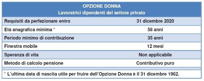 REQUISITIPer le lavoratrici dipendenti i requisiti necessari per avvalersi di questa forma pensionistica – da perfezionare entro il 31 dicembre 2020 – sono 58 anni di età anagrafica (almeno) e 35 anni di contribuzione (almeno).