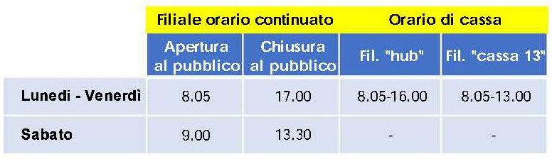 – per le restanti 380 Filiali effettueranno il seguente orario di apertura al pubblico, con mantenimento del Sabato mattina: da Lunedì a Venerdì 8:05 – 17:00 e il Sabato dalle 9:00 – 13:30.