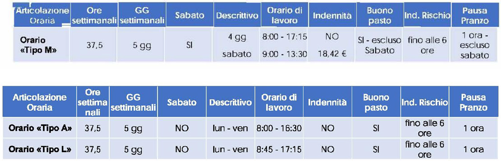 – Orario “L” (senza Sabato) 8:45 – 17:15 per 5 giorni settimanali dal Lunedì a Venerdì con intervallo di 1 ora e con riconoscimento buono pasto